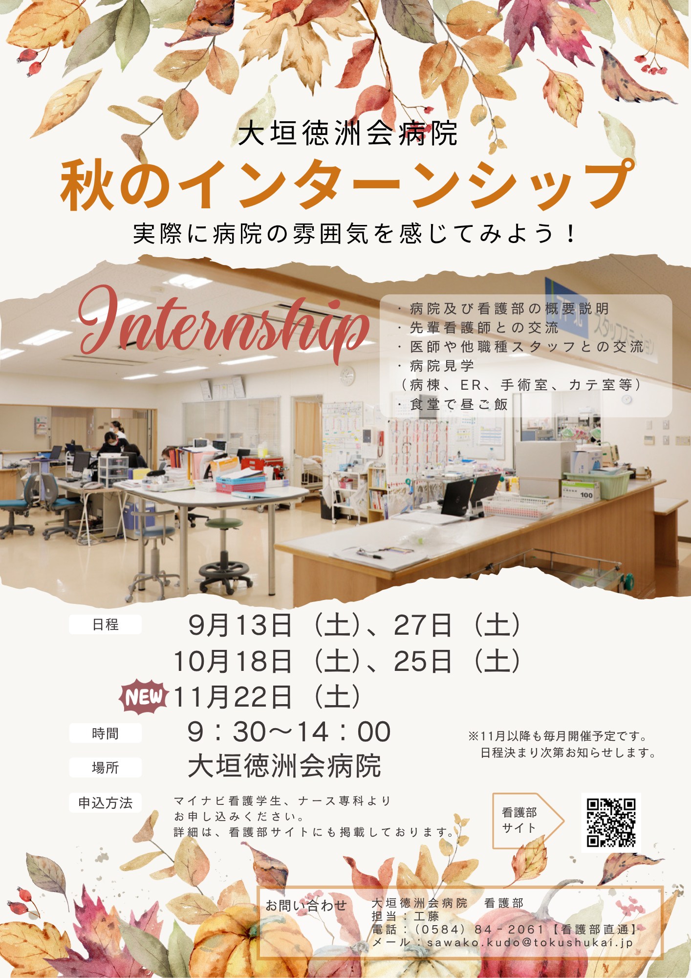インターンシップ 日程・時間 2025年9月13日(土)9:30~14:00(終了) 2025年9月27日(土)9:30~14:00(終了) 2025年10月18日(土)9:30~14:00(受付終了) 2025年10月25日(土)9:30~14:00 2025年11月22日(土)9:30~14:00 毎月開催しております!! 場所 大垣徳洲会病院 4階看護部 対象 2027,2028,2029年卒 内容 9:30 受付 院内見学 看護師業務見学 先輩看護師との交流会 医師や他職種スタッフとの交流 病院概要説明 新人教育の説明 質疑応答 昼食(食堂) 14:00 終了 ※内容については、変更となる場合がございます。ご了承ください。 持ち物 看護学校の実習服 シューズ 健康観察確認シート ご記入の上、当日お持ちください。 飲み物 駐車券 ※駐車場利用の方のみ 申込方法 マイナビまたは、ナース専科よりお申し込みください。